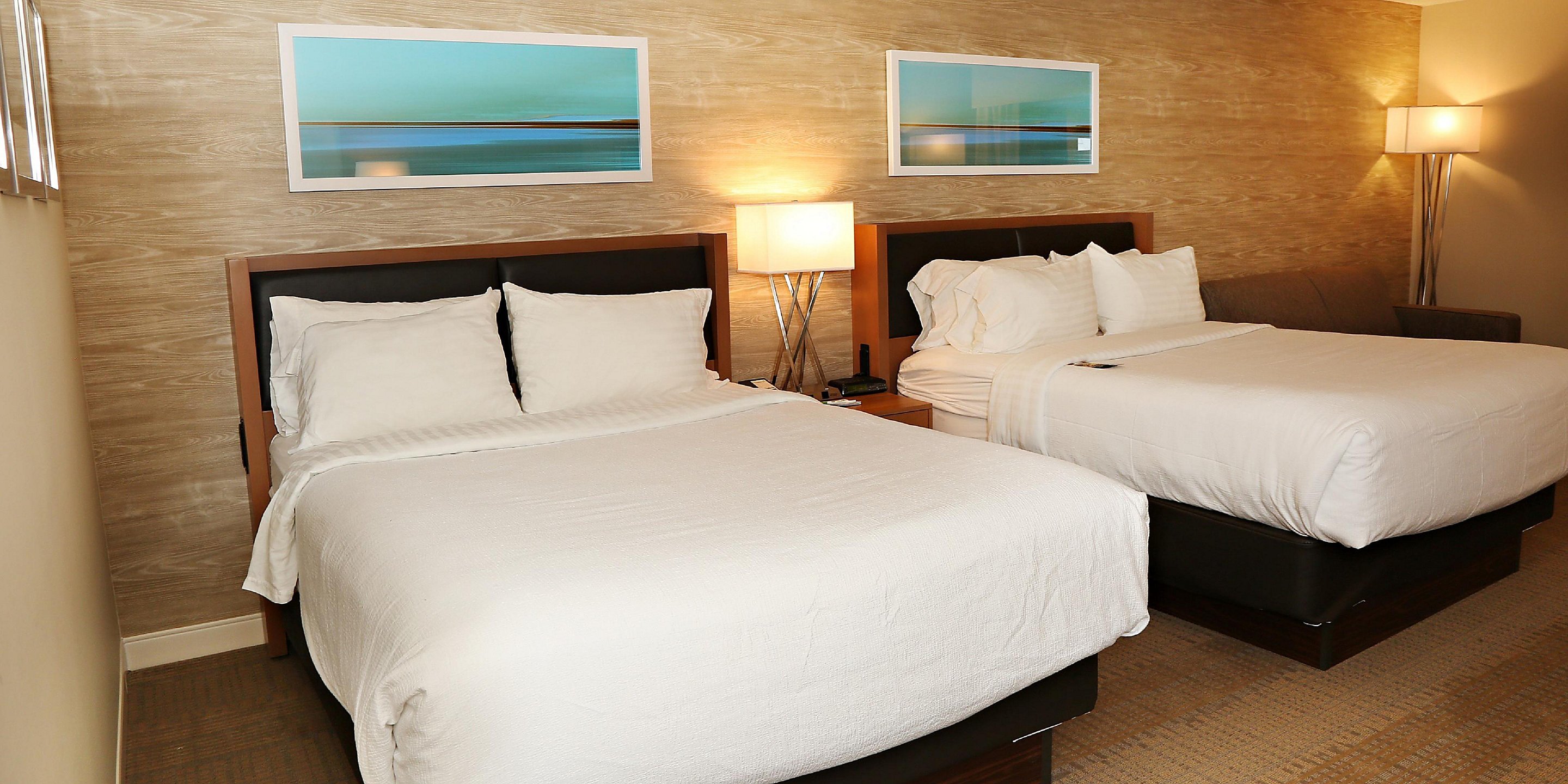Boutique Room ADA (2 queen Beds) Roll in shower 300 -400Sq. Ft. flat screen TV and single cup Keurig coffee maker, work desk and a comfortable desk chair.